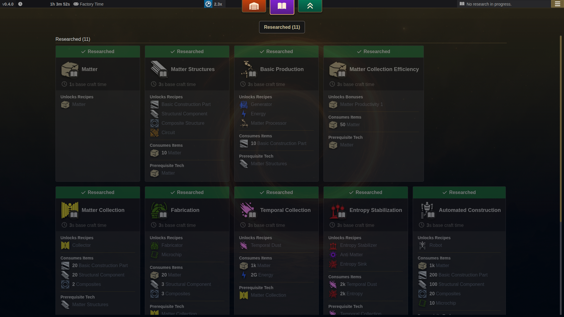 - Unified all cards to have same style (recipe, research, bonus) and show bonuses